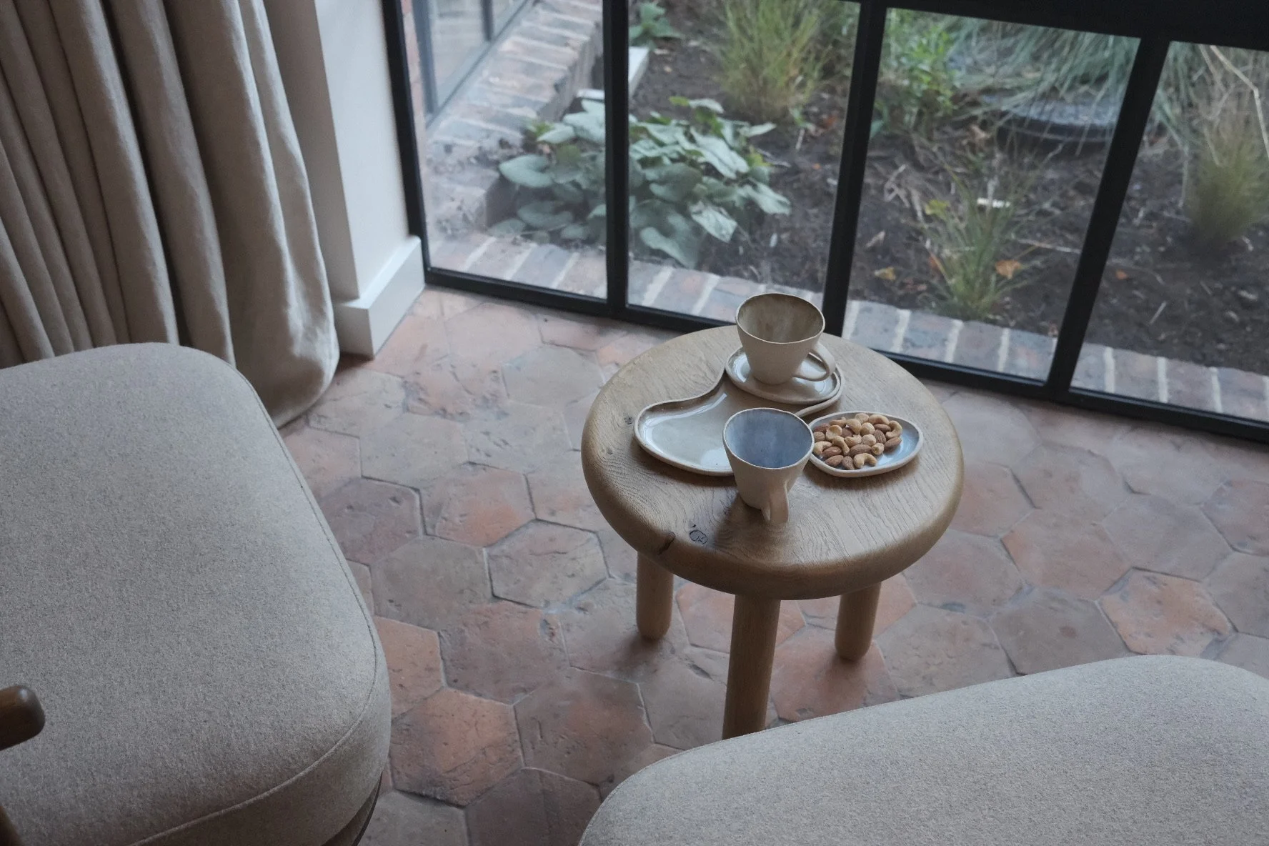 From a single ball of clay, the cup bodies are hand-pinched, with handles applied separately to create elegant, functional forms. The plates, a nod to Studio Taitt’s logo, are rolled and hand-shaped at the edges. Curvy, modular forms provide versatility, allowing cups to sit in saucers, saucers on plates, or indeed all pieces separately. Exposed stoneware clay invites a tactile connection, encouraging a mindful, grounding drinking experience that celebrates touch, texture and the subtle trace of the makers’ hand.